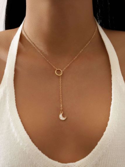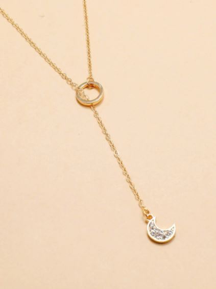 Hermoso collar estilo glamour, color dorado, tiene un detalle de luna y un círculo, material aleación.