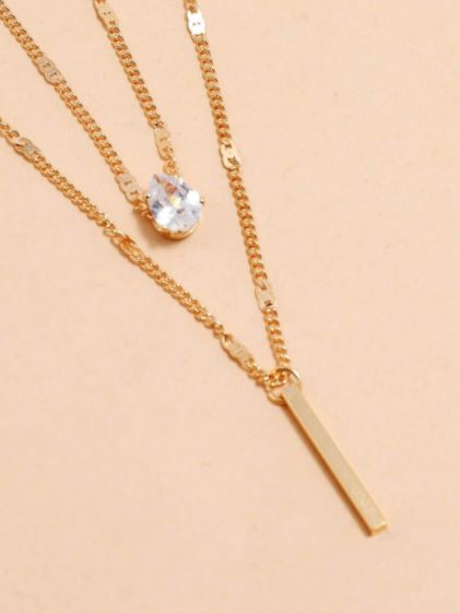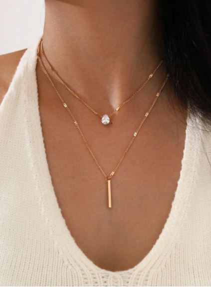 Set de dos piezas estilo casual, color dorado, tiene detalles geométricos y una piedra brillante, material cobre.