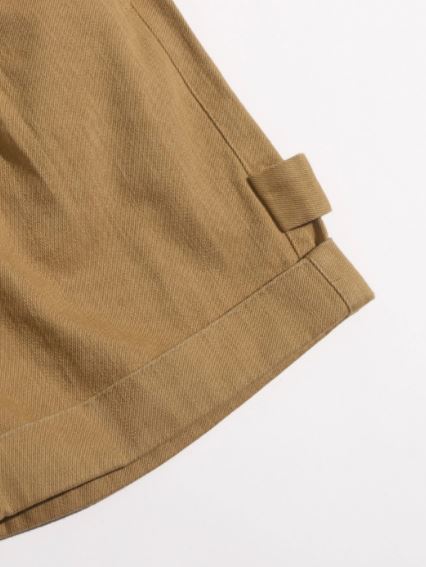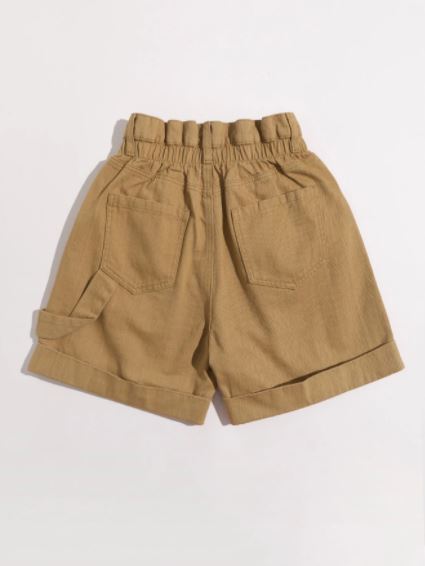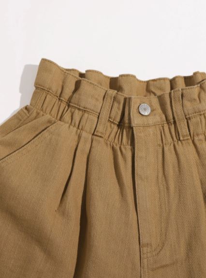 Linda pantaloneta estilo casual, se encuentra en color camel, tiene detalles como botón adelante, bolsillos, cremallera y cintura con volante, tiene talle alto, material algodón y poliéster (no elástico).