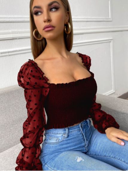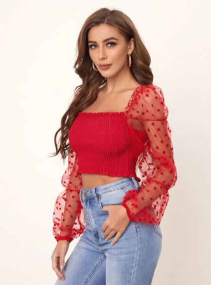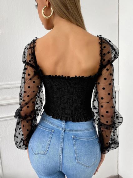 Blusa estilo sexy tiene un pequeño estampado de lunares, tiene detalles como malla en contrate, volante fruncido, tiene une escote cuadrado y es manga larga abombado y transparente, se encuentra en 8 colores diferentes, material 100% poliéster (poco elástico).